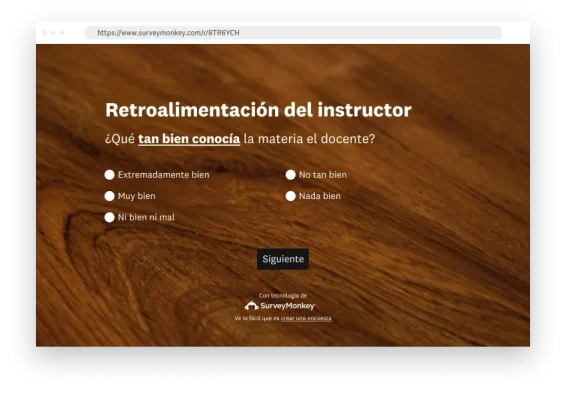 Ejemplo: La Sra. Rivera quiere crear una encuesta para obtener retroalimentación de sus estudiantes al final del semestre. Para ello, decide usar una cuenta gratuita de SurveyMonkey. Elige un tema preestablecido de alto contraste, cambia la fuente a una Sans-Serif amigable, agrega el escudo de la escuela como pequeño logotipo en el encabezado y envía una encuesta de percepciones rápidas a la clase, sin necesidad de conocimientos de diseño. Comienza gratis.