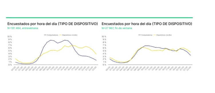 Sin embargo, la visibilidad no depende solo del día. Los dispositivos que usan los encuestados varían a lo largo de la jornada, y esto influye en la facilidad con la que pueden responder. Al final de la tarde y en la noche, predomina el uso de dispositivos móviles, mientras que por la mañana y en las primeras horas de la tarde suele haber más actividad desde computadoras.