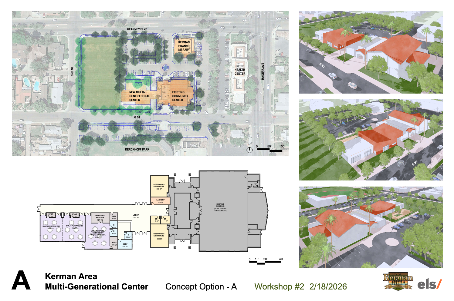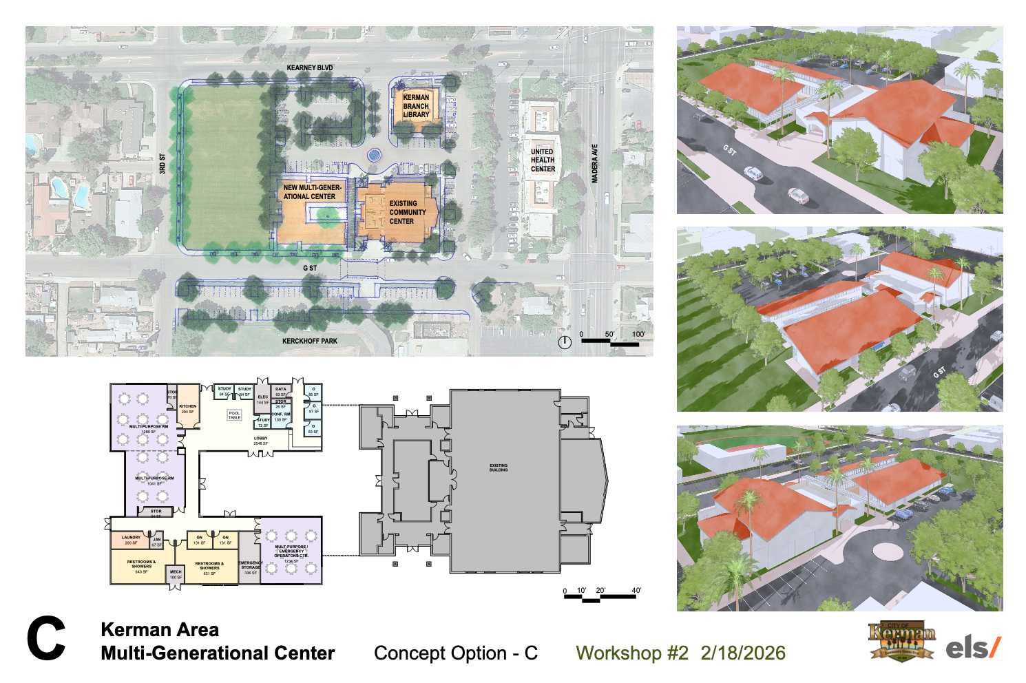 El Concepto C, como todas las opciones de concepto, reconfigura los espacios de estacionamiento al otro lado de la calle en el Parque Kerckhoff, lo que permite que el centro mantenga su cantidad actual de estacionamientos; esto proporciona más espacio para la remodelación del sitio del proyecto.