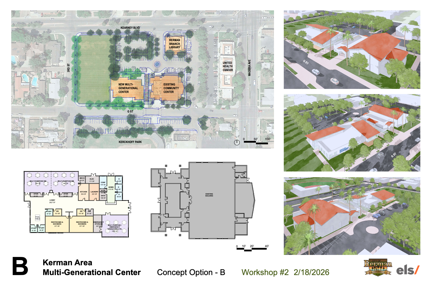 Expansión Separada: Mantener el nuevo edificio separado del edificio existente permite que el proyecto evite una renovación sísmica del centro comunitario actual; esto permite que el nuevo edificio sea más grande que el del Concepto A, con más oportunidades de programación.