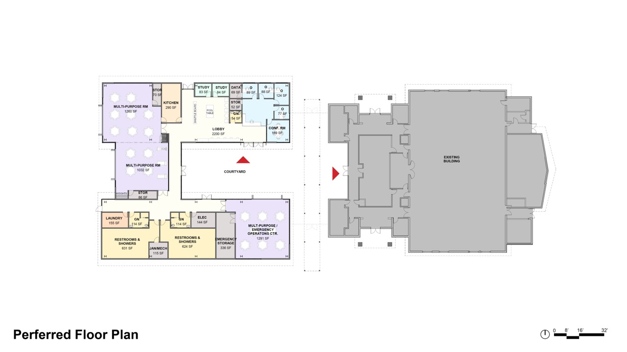 Expansión separada: Mantener el nuevo edificio separado del edificio existente permite que el proyecto evite una modernización sísmica del centro comunitario existente; esto permite que el nuevo edificio sea más grande, con más oportunidades de programación.