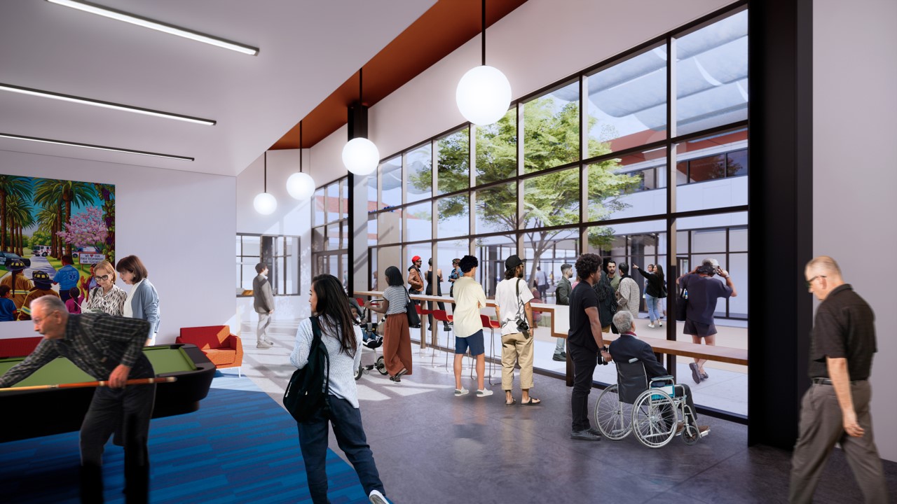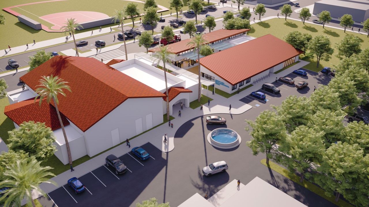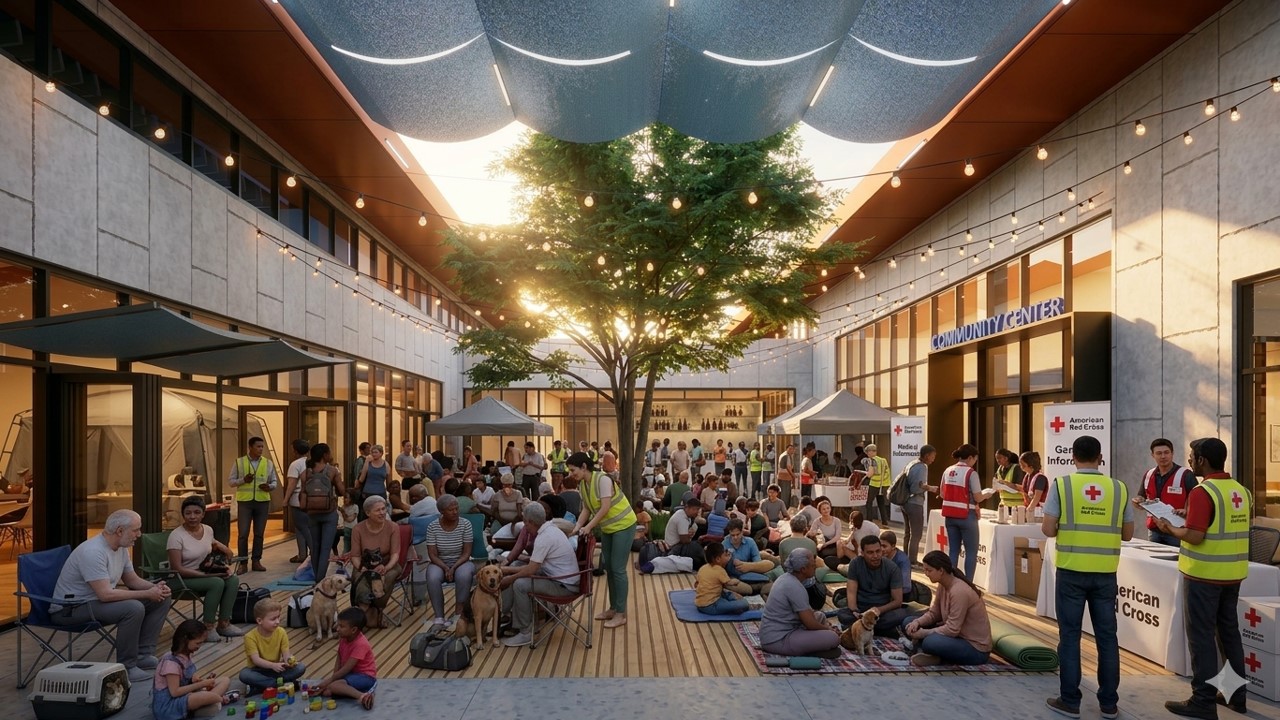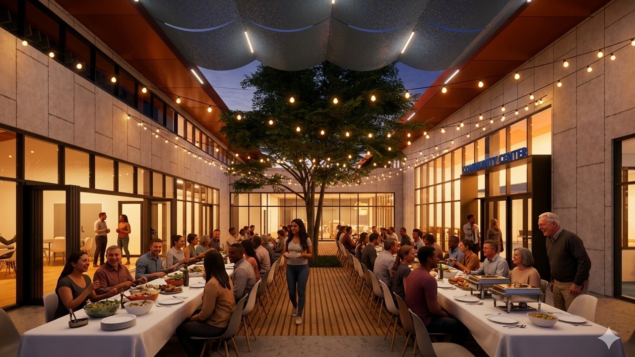 Carácter arquitectónico: Las formas de techo inclinado complementan los techos a dos aguas del centro comunitario existente mientras enmarcan el patio central. Esta coherencia ayuda a establecer una presencia cívica reconocible y un lenguaje arquitectónico que respalda una comunidad cohesionada y un campus orientado a la resiliencia.