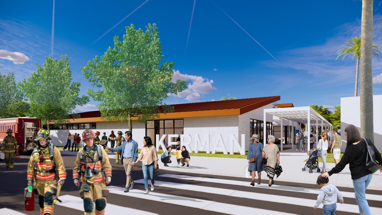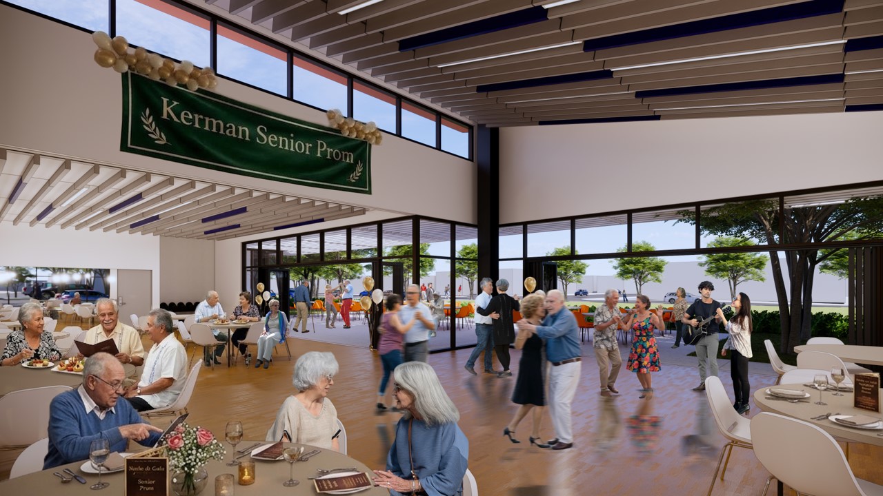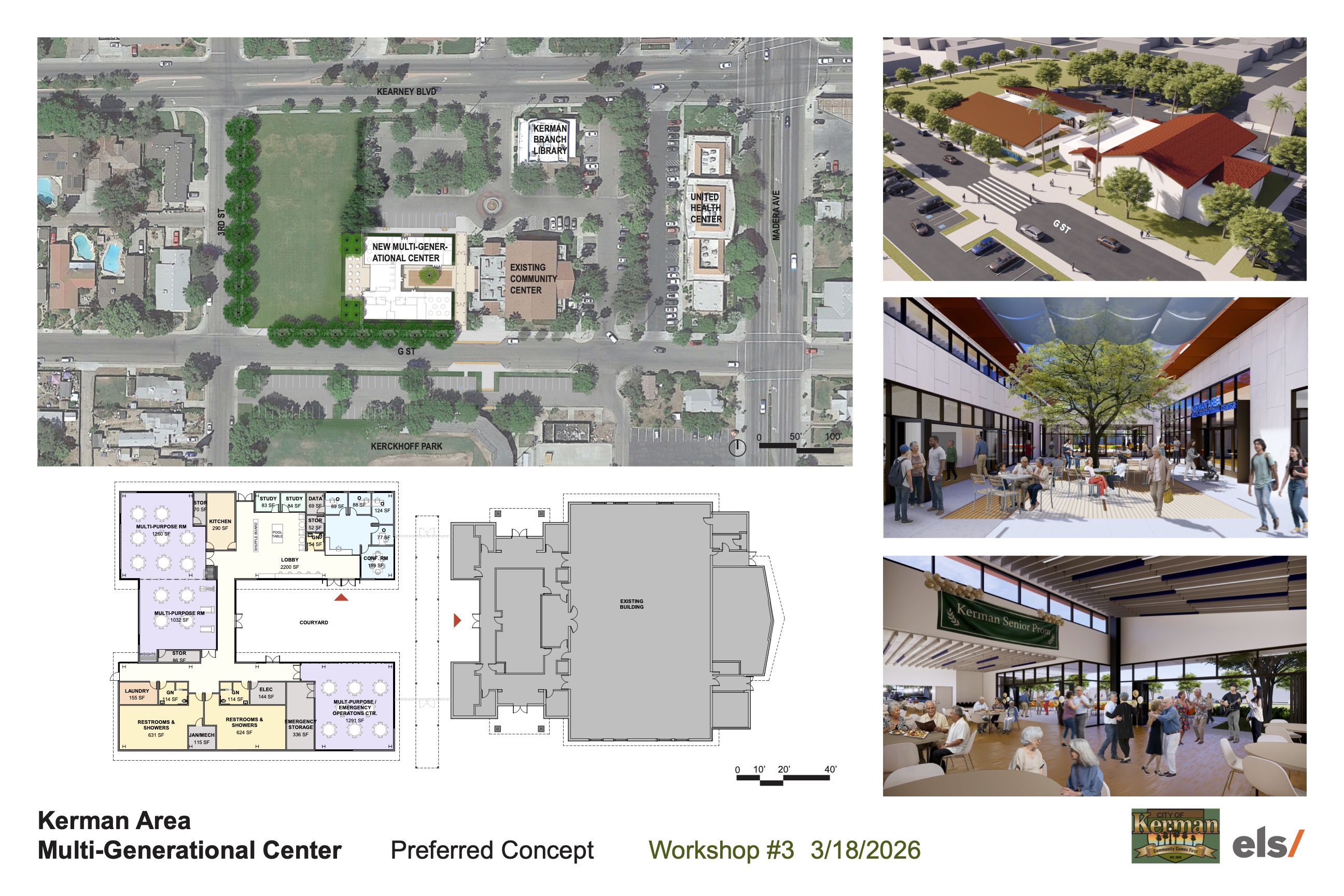 Organización: El nuevo centro está organizado alrededor de un patio central que proporciona un espacio interior-exterior aislado para reuniones y pequeños eventos. Los espacios interiores en el perímetro del edificio ofrecen vistas hacia G St y Kerckhoff Park al sur, el parque al oeste y el estacionamiento al norte. El nuevo centro alberga salas multiusos, operaciones de emergencia, almacenamiento de emergencia, salas de conferencias privadas, espacios administrativos, cocina, lavandería, baños y duchas.