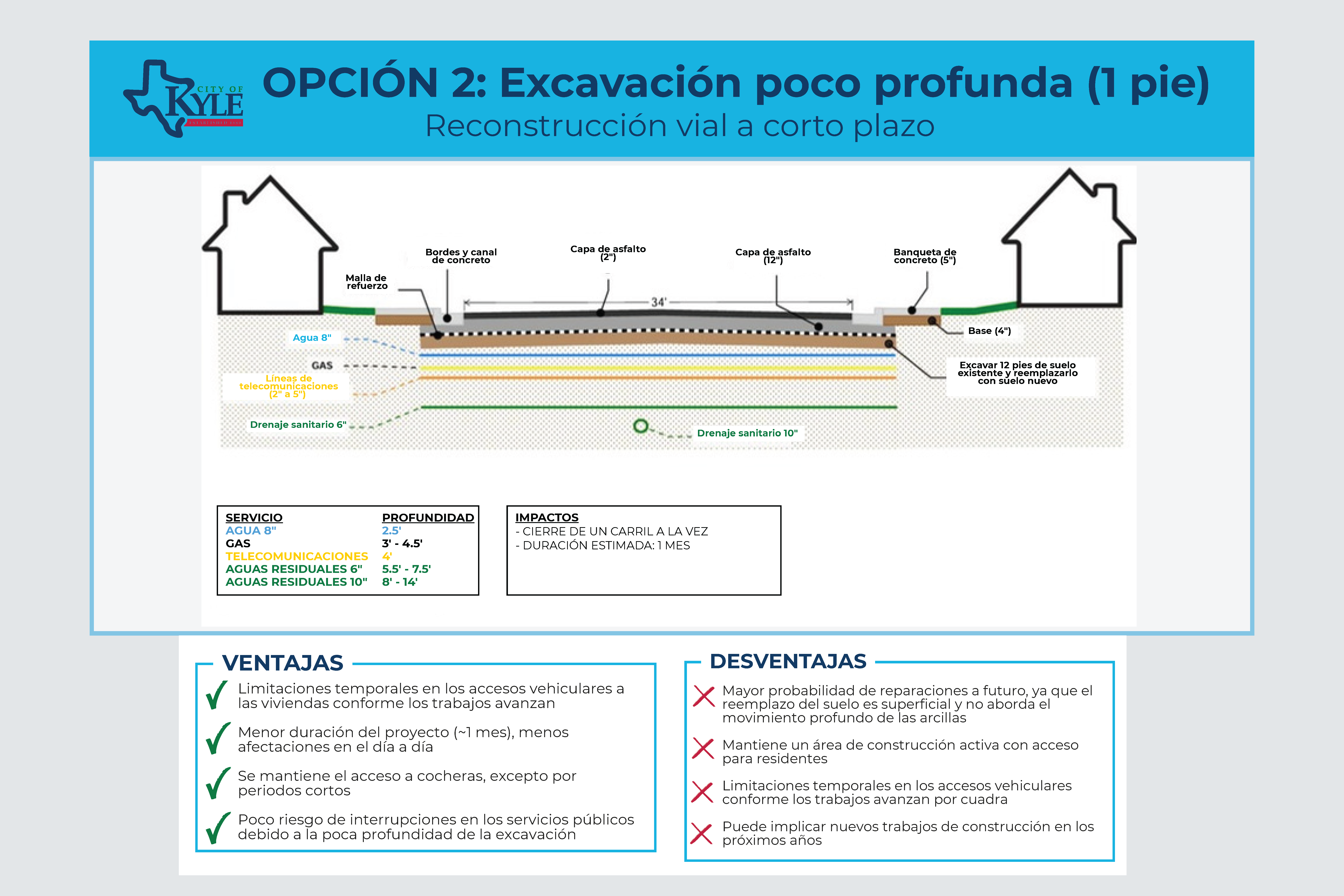 Esta opción reconstruiría la calle al retirar y reemplazar aproximadamente 1 pie de suelo debajo de la vía. Sería más rápida y menos disruptiva que una reconstrucción más profunda, con un carril cerrado a la vez y, por lo general, manteniendo el acceso a las cocheras excepto por periodos cortos. Sin embargo, como no aborda el movimiento del suelo en capas más profundas, podría generar más reparaciones y una futura construcción antes que una reconstrucción completa.
