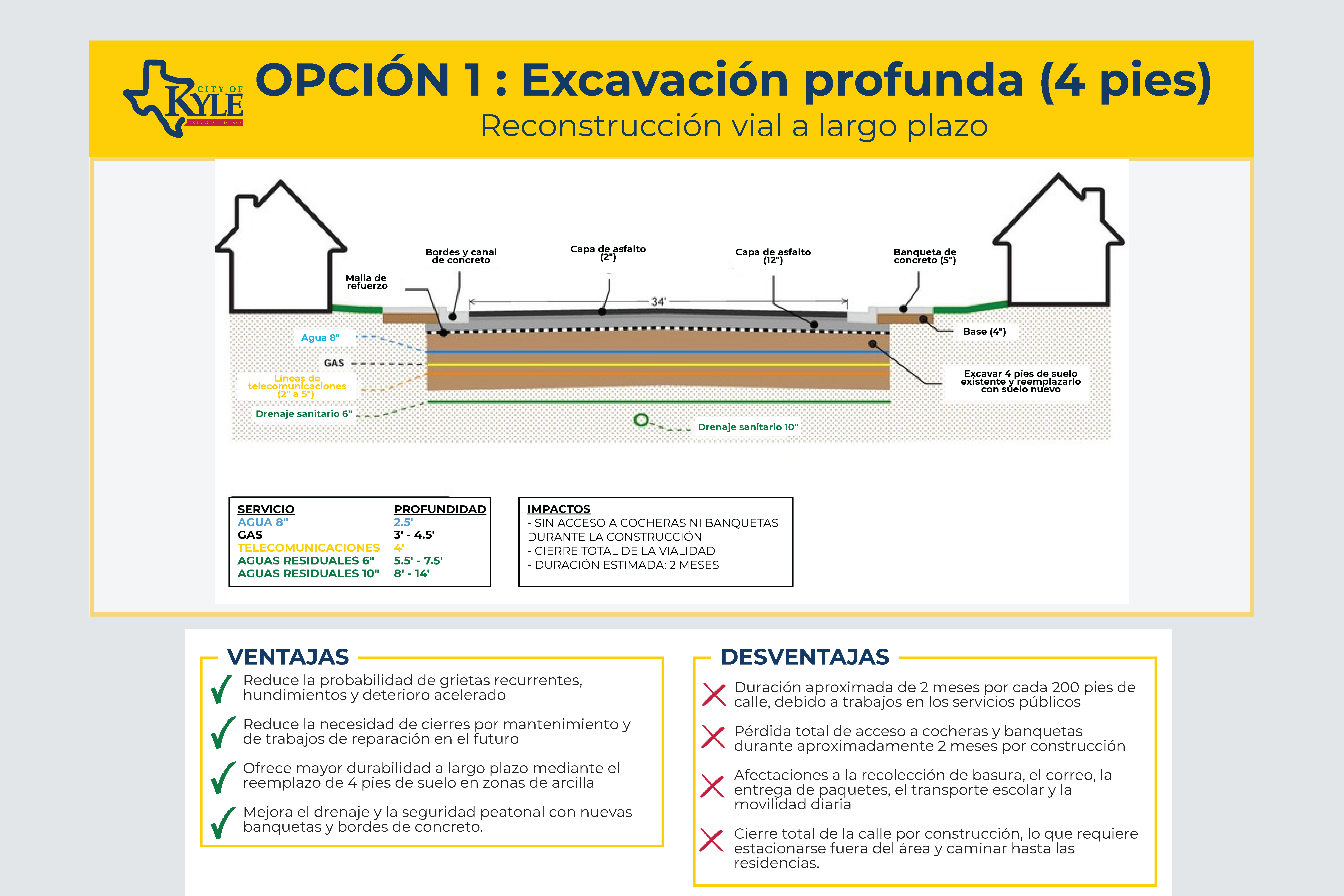 Esta opción reconstruiría por completo la calle al excavar aproximadamente 4 pies de profundidad, retirar el suelo inestable y reconstruir la vía con pavimento, guarnición, cuneta y banqueta nuevos. Ofrece la mayor durabilidad a largo plazo y podría reducir futuras grietas y reparaciones, pero requeriría cierres totales de la calle y causaría interrupciones temporales importantes, incluida la pérdida de acceso a cocheras y otros impactos a la movilidad durante la construcción.